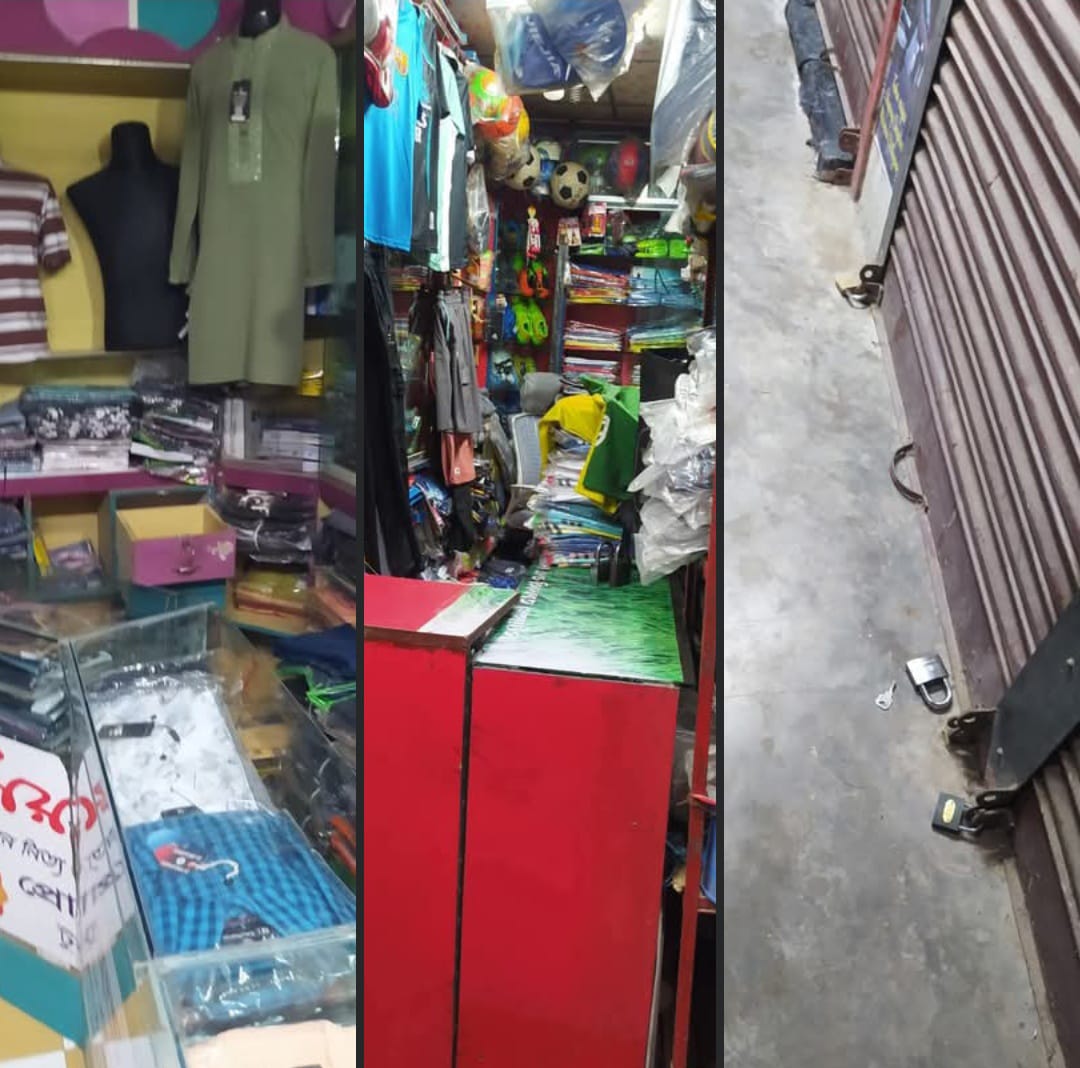 বিছমিল্লাহ কুলিং কর্ণারের সত্বাধিকারী মো. করিম বলেন, ‘সোমবার সকালে দোকানে এসে দেখি দোকানের তালা ভাঙা। ভিতরে গিয়ে দেখি সিগারেট, চায়ের দুধসহ যাবতীয় জিনিসপত্র নিয়ে যায়। এতে আমার প্রায় ১২ হাজার টাকার ক্ষতি হয়েছে।’