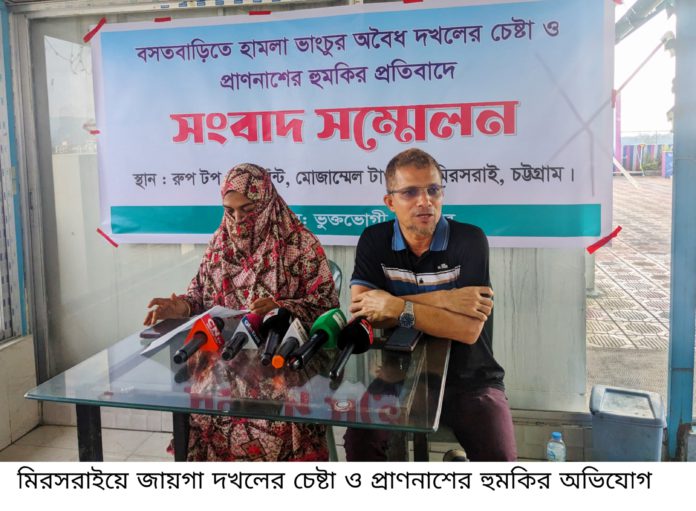 চট্টগ্রামের মীরসরাইয়ের বারইয়ারহাট পৌরসভার মেহেদীনগরে জায়গা দখলের চেষ্টা ও প্রাণনাশের হুমকির অভিযোগ পাওয়া গেছে। শনিবার (১৮ অক্টোবর) দুপুরে মীরসরাই সদরের মোজাম্মেল টাওয়ারের রুফটপ রেস্টুরেন্টে আয়োজিত সংবাদ সম্মেলনে ভুক্তভোগী সাবরিন তাহছিনা লিখিত বক্তব্যেও মাধ্যমে এই অভিযোগ করেন।