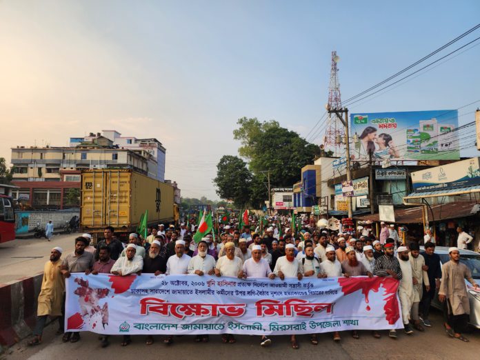 বাংলাদেশ জামায়াতে ইসলামী মীরসরাই উপজেলা শাখার উদ্যোগে ২৮ অক্টোবর হত্যাকাণ্ডের প্রতিবাদ ও খুনিদের বিচারের দাবিতে এক বিক্ষোভ মিছিল ও সমাবেশ অনুষ্ঠিত হয়েছে।